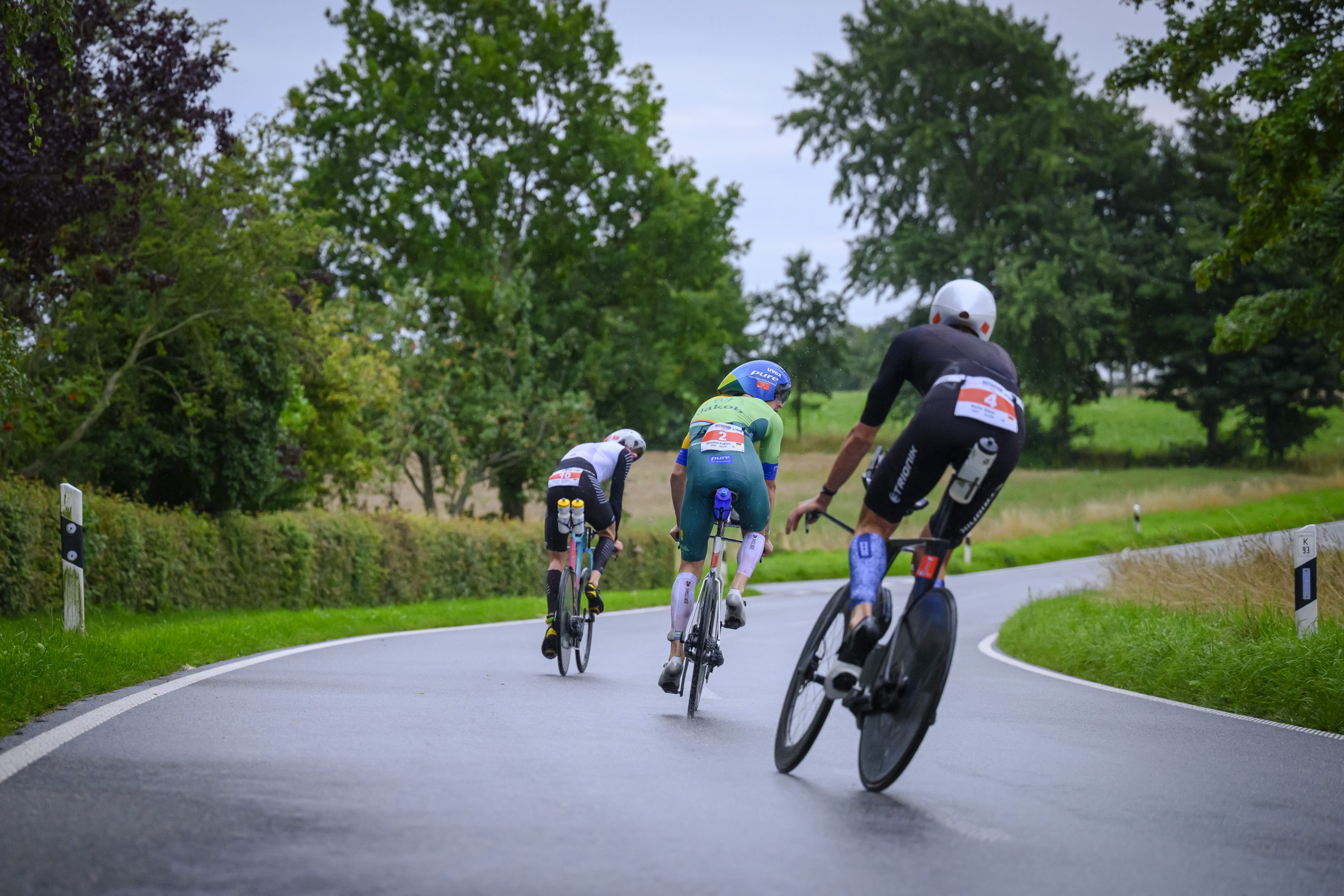 In bester Rekordlaune präsentierte sich Timo Schaffeld bei seinem zweiten Start beim OstseeMan-Triathlon. Der Oberhausener kam mit einer Minute Rückstand auf die Führungsgruppe aus dem Wasser und trat auf regennasser Straße in der ersten von vier 45-km-Runden gleich mächtig in die Pedale. Am Ende der Runde konnte er sich an die Spitze setzen und gab diese Position fortan nicht mehr ab. Im weiteren Verlauf der Radstrecke baute Schaffeld den Abstand zu den Mitstreitern weiter aus und ging mit fast sieben Minuten Vorsprung auf die Laufstrecke. Dass ein solcher Abstand noch lange keinen Sieg garantiert, hatte 2022 der Butzbacher Simon Huckestein bewiesen, als er sogar einen 10-Minuten-Rückstand noch in einen Sieg verwandelt hatte. Der drohenden Aufholjagd des Titelverteidigers setzte Schaffeld dieses Mal jedoch selbst einen famosen Marathon entgegen und rannte mit der schnellsten Laufzeit des Tages (2:49:20 Std.) zu Sieg und Streckenrekord. „Als ich gesehen habe, dass Simon gar nicht näher kommt und der Abstand dann sogar größer wird, habe ich die zweite Luft bekommen. Der Zieleinlauf war dann fast das schönste, was ich im Triathlon bisher erlebt habe“, freute sich Schaffeld über einen für ihn perfekten Wettkampf, mit dem er in 8:11:32 Stunden die bisherige Streckenrekordmarke um mehr als zwölf Minuten verbesserte. Vorjahressieger Simon Huckestein kam nach 8:24:56 Stunden als Zweiter ins Ziel und verbesserte damit seine Vorjahreszeit sogar um eine halbe Minute. Für den Sieg reichte das aber nicht. „Beim Schwimmen war ich etwas zu langsam und dann wollte ich den Rückstand auf dem Rad schon umbiegen und habe wohl übertrieben. Beim Laufen war ich dann leer und habe früh gemerkt, dass es sich nicht mehr gut anfühlt“, erklärte Huckestein sein Rennen. Den dritten Platz erkämpfte sich der Berliner Silas Köhn in 8:25:59 Stunden. Der Vorjahreszweite Fabian Günther (Hamburg) musste das Rennen nach einer Radpanne vorzeitig abbrechen.